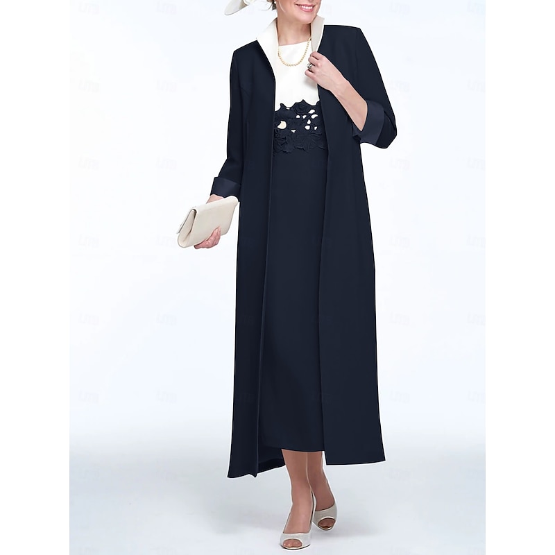 Two Piece Sheath Mother of the Bride Dress Wedding Guest Church Elegant Jewel Neck Ankle Length Stretch Fabric Sleeveless with Appliques Race Day Dress 1