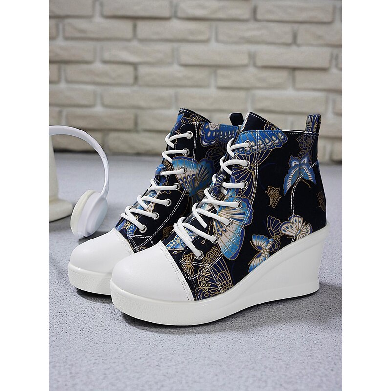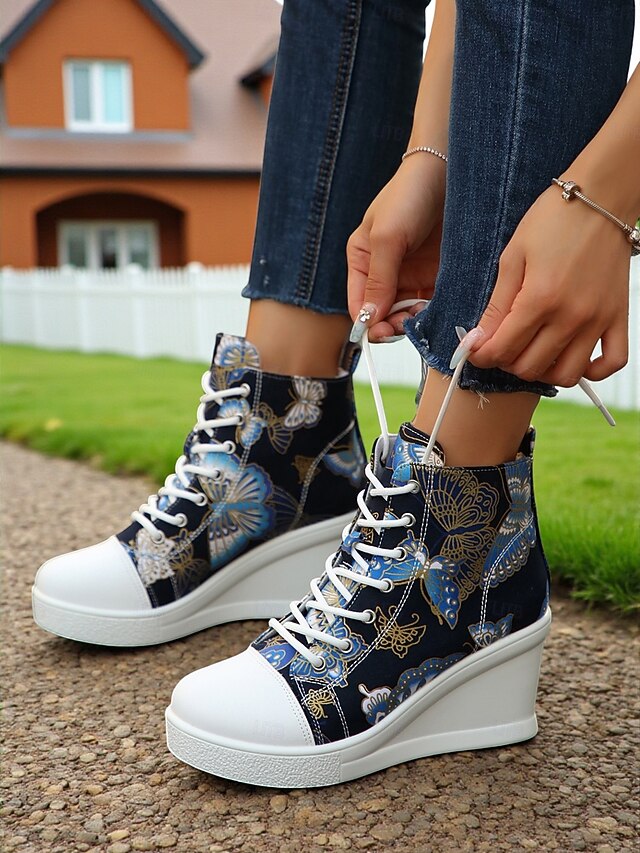 Women's Blue Denim Wedge Sneakers with Butterfly Print – Casual Lace-Up Hidden Heel Boots for Travel, Streetwear and Everyday Outfits 21