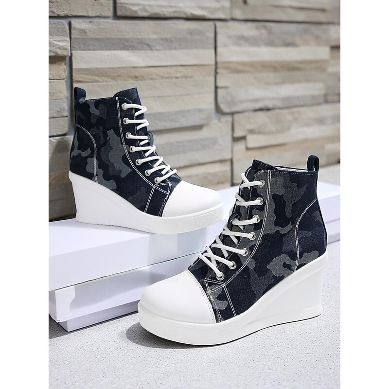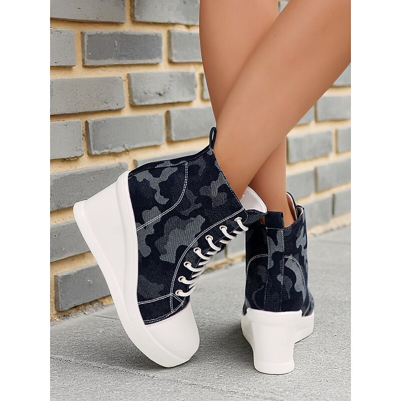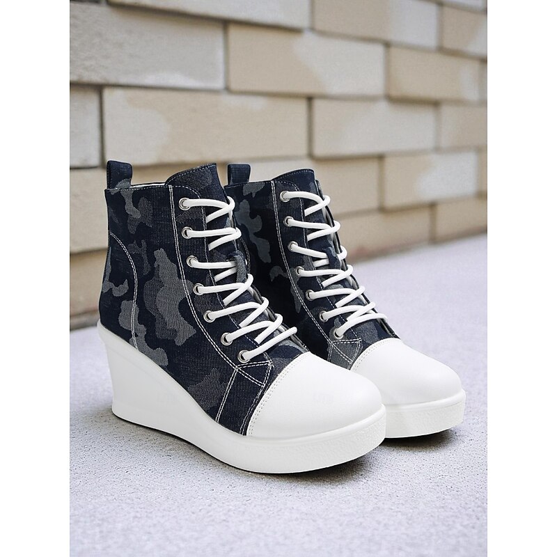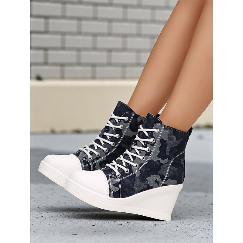 Women's Blue Denim Wedge Sneakers with Butterfly Print – Casual Lace-Up Hidden Heel Boots for Travel, Streetwear and Everyday Outfits 17