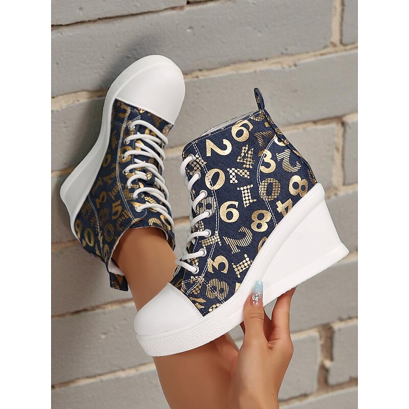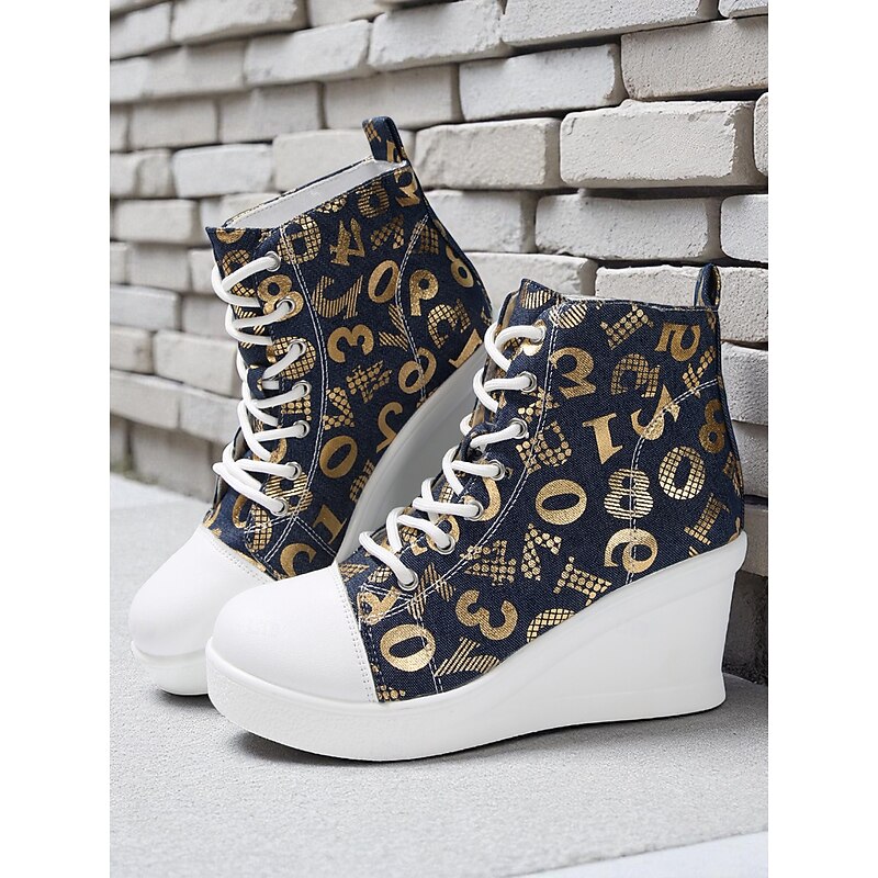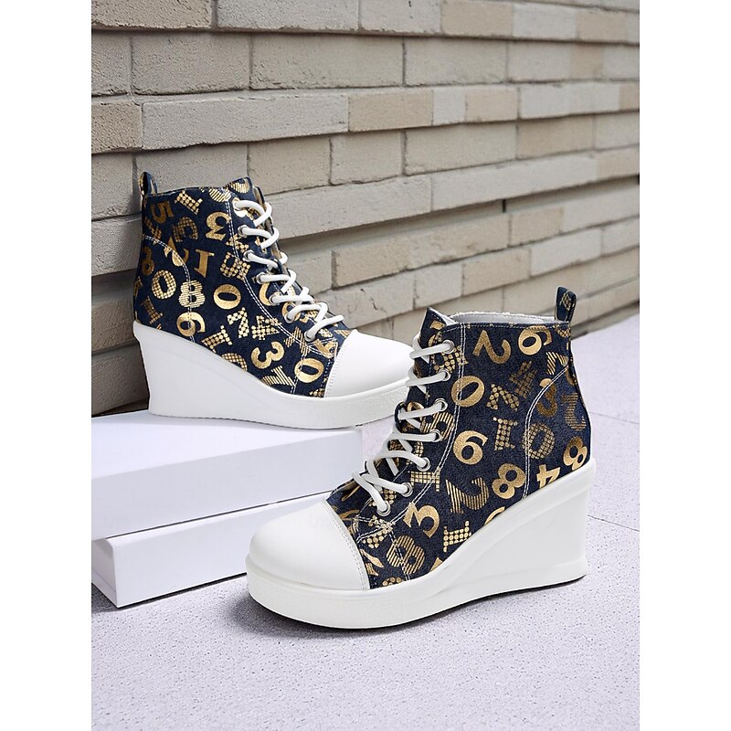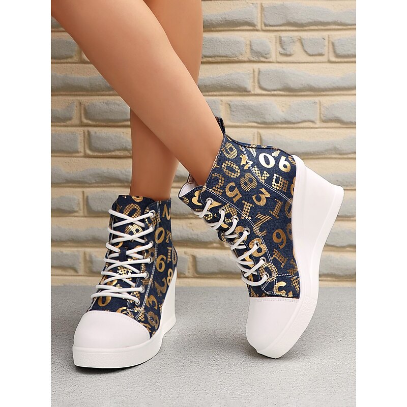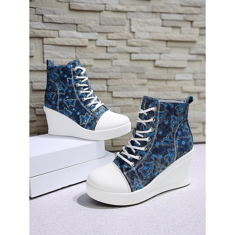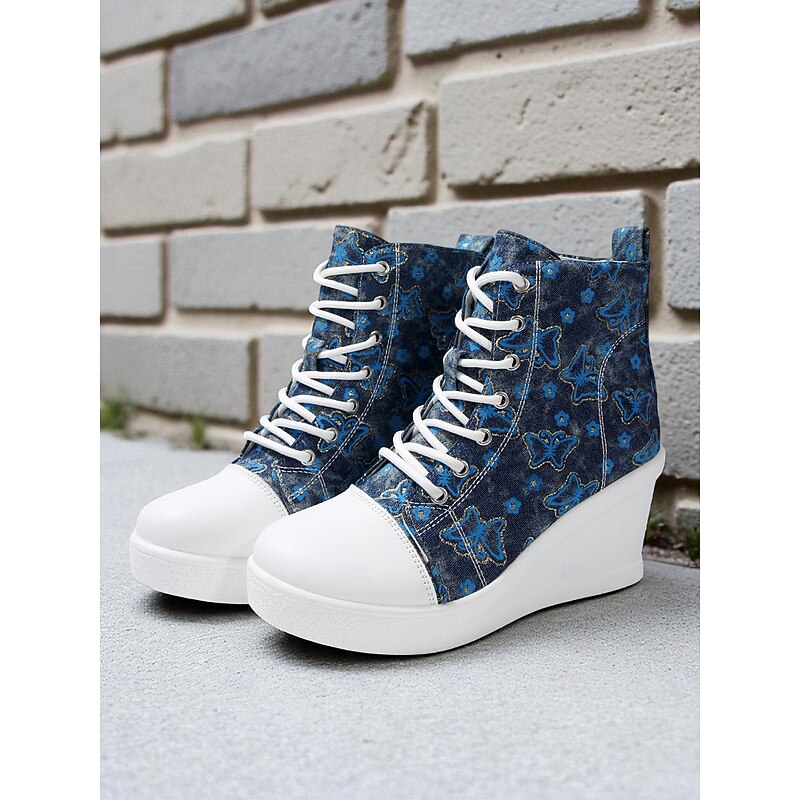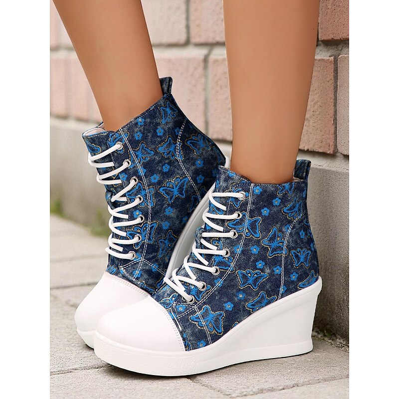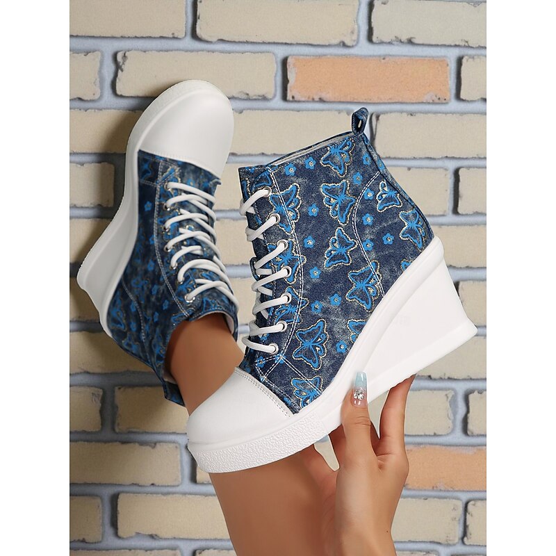 Women's Blue Denim Wedge Sneakers with Butterfly Print – Casual Lace-Up Hidden Heel Boots for Travel, Streetwear and Everyday Outfits 23