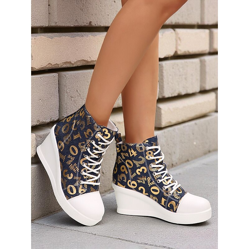 Women's Blue Denim Wedge Sneakers with Butterfly Print – Casual Lace-Up Hidden Heel Boots for Travel, Streetwear and Everyday Outfits 14