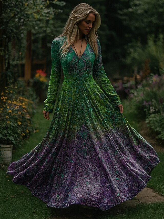 More information about Christmas Women's Maxi Dress Pleated Dress Party Casual Boho Daily Date Going out Regular Fit Ombre Christmas Tree Long Sleeve V Neck Red Blue Purple Green Spring Fall Winter