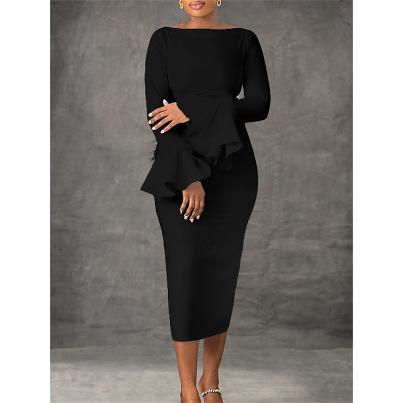 HOT ! Women's White Dress Party Dress Feather Dress Feather Crew Neck Long Sleeve Midi Dress Winter Dress Wedding Guest Black White Summer Spring