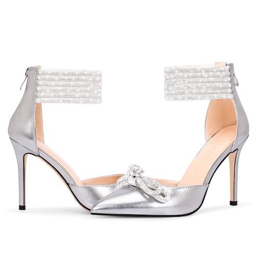 100FIXEO Women's Sexy Rhinestone Bow High Heeled Pumps Pointed Toe Ankle Strap Stiletto Heel Wedding Dress Shoes 4
