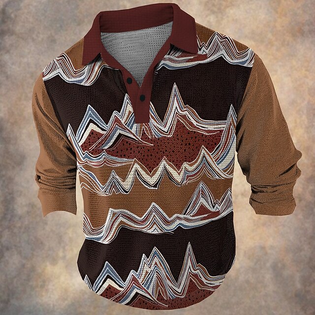 Men's Geometric Waffle Polo Shirts Long Sleeve Polo Shirts Collar Vintage Casual Vacation Party Evening Wear Dailywear Buttons 3D Print Spring Fall Winter Brown 3