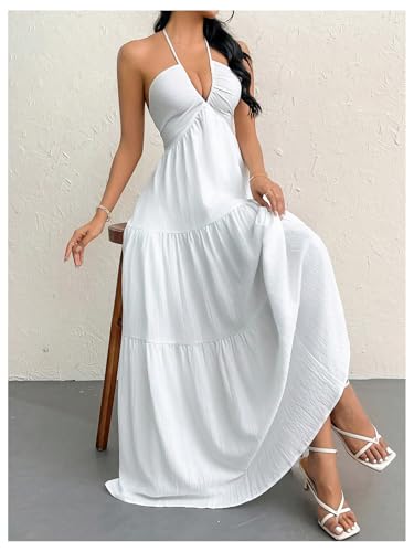 HOT ! SHENHE Women's Deep V Neck Tie Knot Backless Halter Dress A Line Flowy Ruffle Maxi Dress