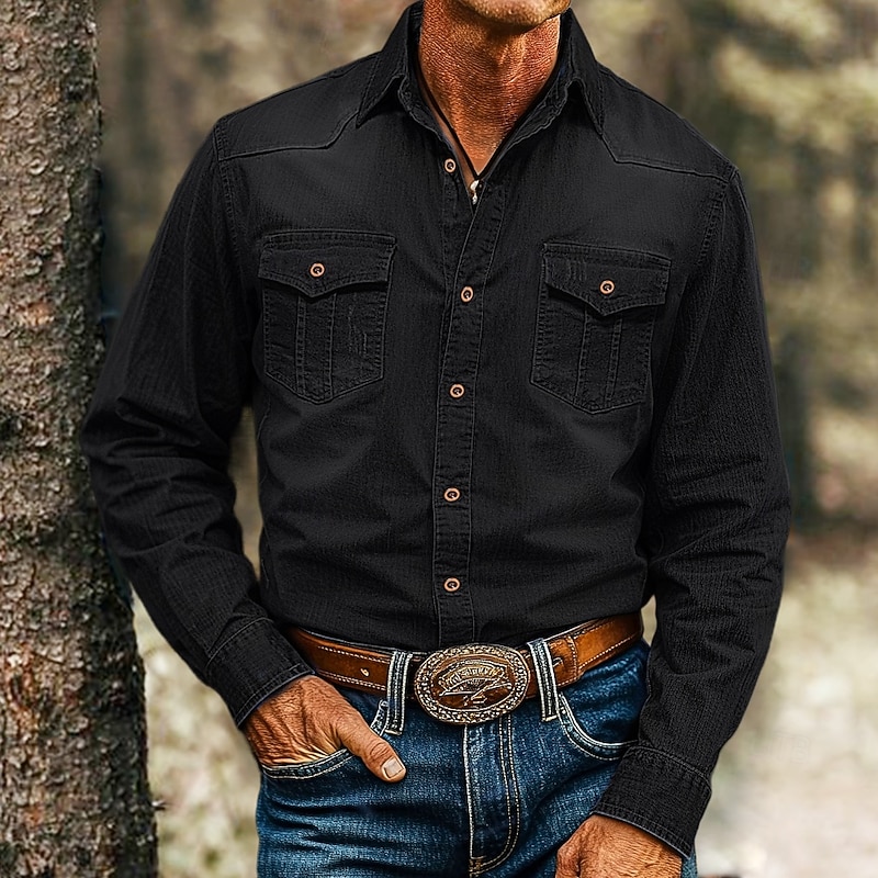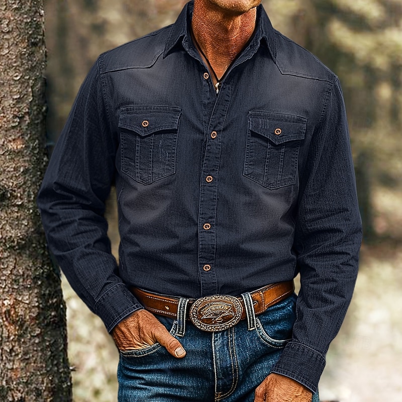 Highlights [Fabric] : Crafted from high-quality cotton, this men's denim shirt offers excellent moisture-wicking and breathable properties, ensuring comfort during the warmer spring and summer months. The light blue fabric provides durability while maintaining a lightweight feel, ideal for casual wear. [Fit] : Featuring a relaxed fit, this shirt allows for ease of movement, making it perfect for both daily activities and leisurely outings. The comfortable cut ensures a laid-back yet stylish appearance. [Design Highlights] : This shirt presents a classic Western style with distinctive elements such as a button-down front equipped with metallic snap closures for an authentic touch. Additional design details include long sleeves with buttoned cuffs for adjustable comfort, two chest pockets with flap closures, and pointed yokes on the front and back, embracing the traditional Western aesthetic. [Occasions] : Perfect for vacations, daily outings, and casual events, this shirt combines fashion and function, making it a versatile addition to any wardrobe. Pair it with jeans and a wide belt for a complete cowboy-inspired look, fitting various relaxed and outdoor settings. [Size Range] : Available in sizes S through 2XL, providing options for a range of body types and ensuring the perfect fit for everyone. Available in four versatile colors—Blue, Black, Dark Gray, and Light Blue—this shirt caters to diverse style preferences.