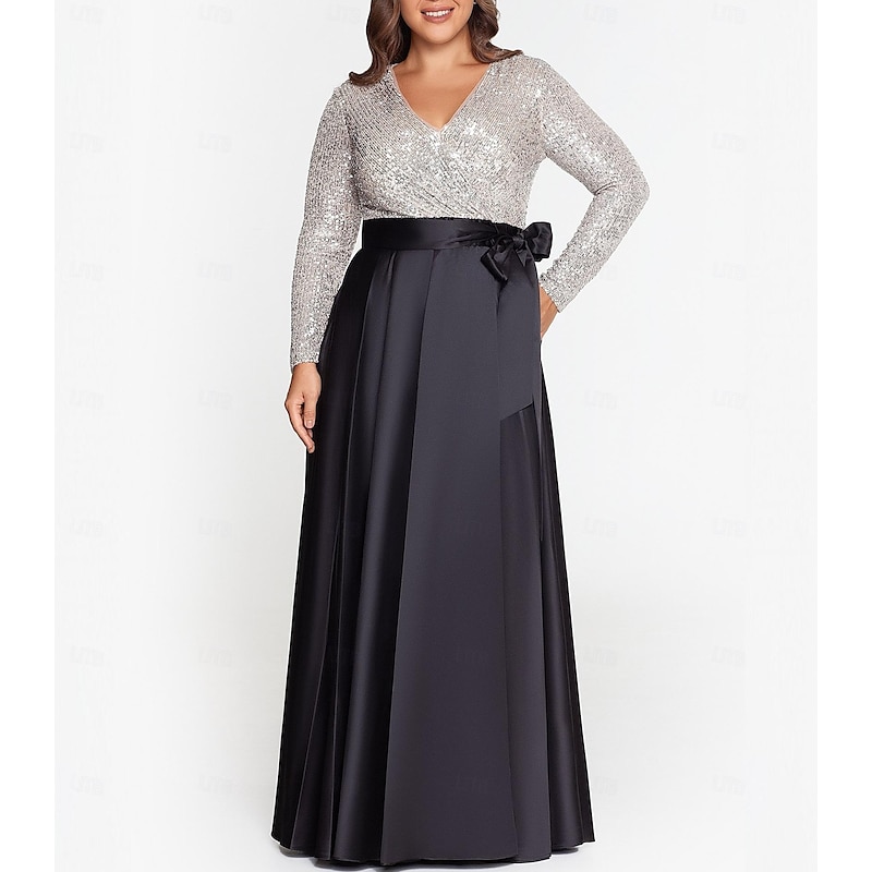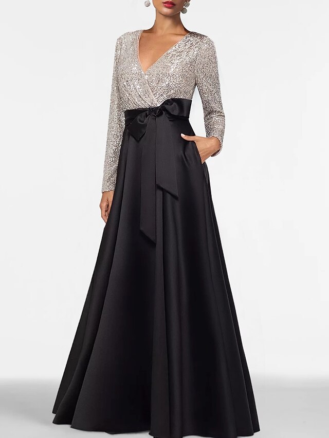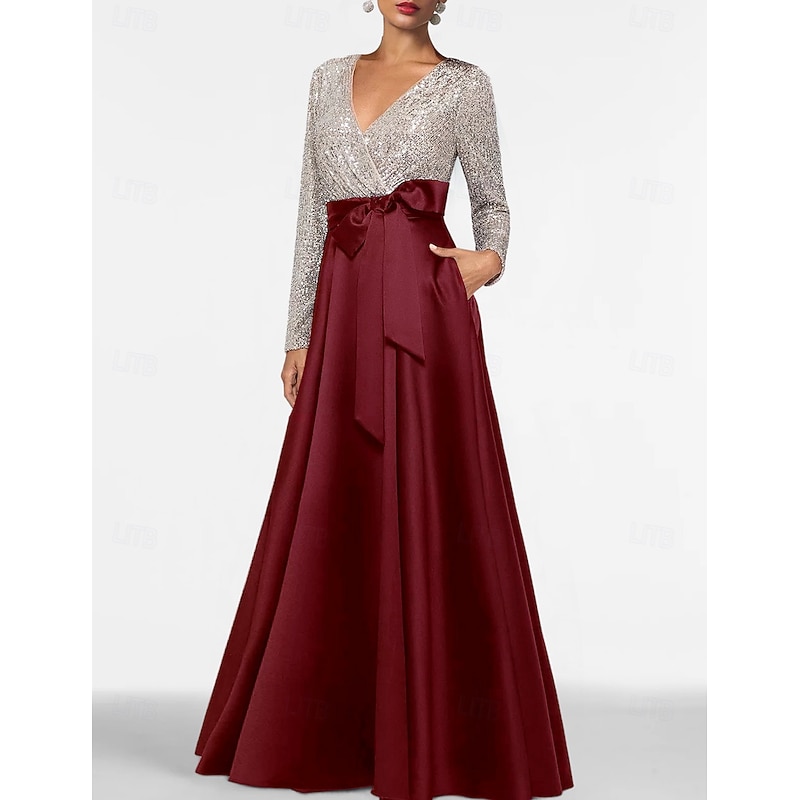 More information about A-Line Mother of the Bride Evening Gown Elegant Dress Formal Floor Length Long Sleeve V Neck Fall Wedding Guest Satin with Sequin Pocket