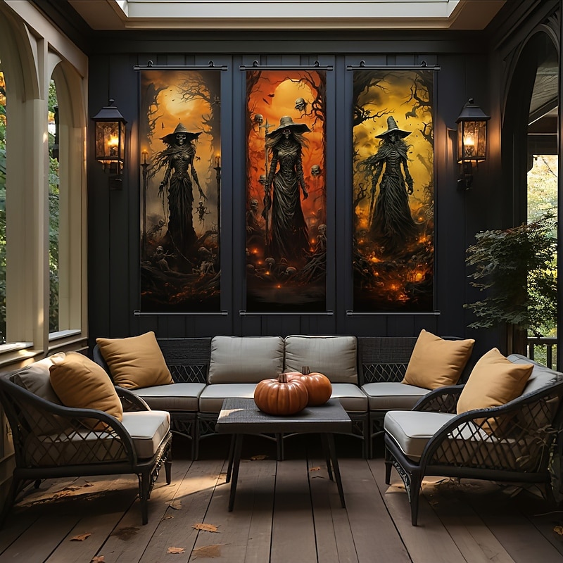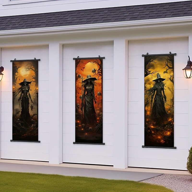 HOT ! 1pc Halloween Poster with Hangers Courtyard Skeleton Ghost Pumpkin Bat Party Witch Painting Lantern Enchantress Wall Art Canvas Posters Art For Home Living Room Decoration Wall Art Decor