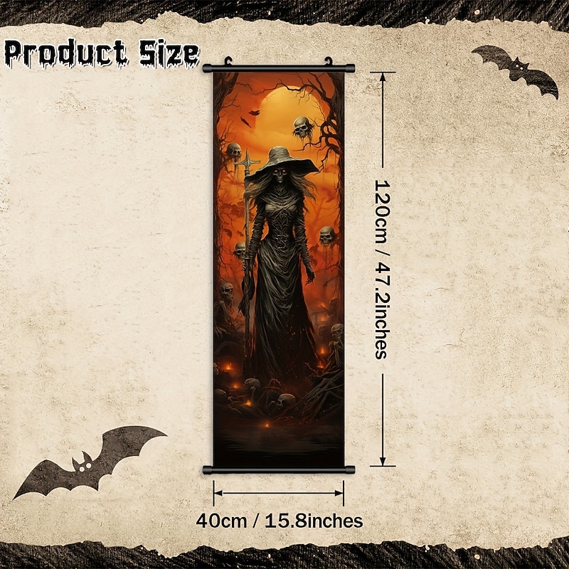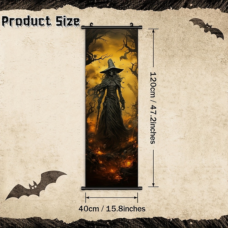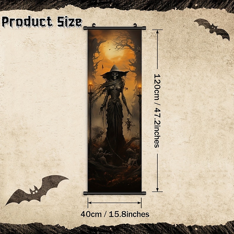 1pc Halloween Poster with Hangers Courtyard Skeleton Ghost Pumpkin Bat Party Witch Painting Lantern Enchantress Wall Art Canvas Posters Art For Home Living Room Decoration Wall Art Decor 12