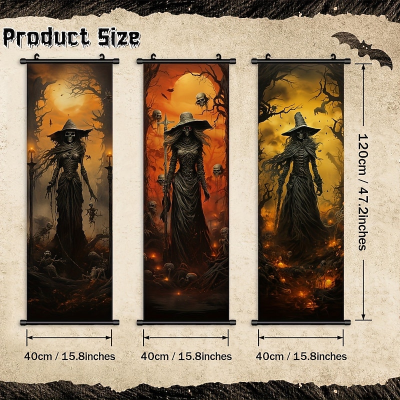 More information about 1pc Halloween Poster with Hangers Courtyard Skeleton Ghost Pumpkin Bat Party Witch Painting Lantern Enchantress Wall Art Canvas Posters Art For Home Living Room Decoration Wall Art Decor