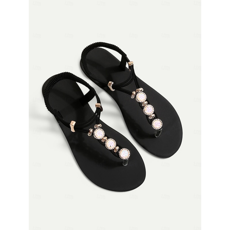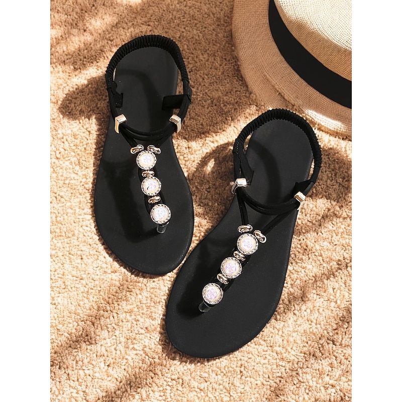 Women's Bohemian Rhinestone Flat Sandals – Elegant T-Strap Summer Beach Sandals with Pearl Beaded Design for Vacation & Casual Wear 1