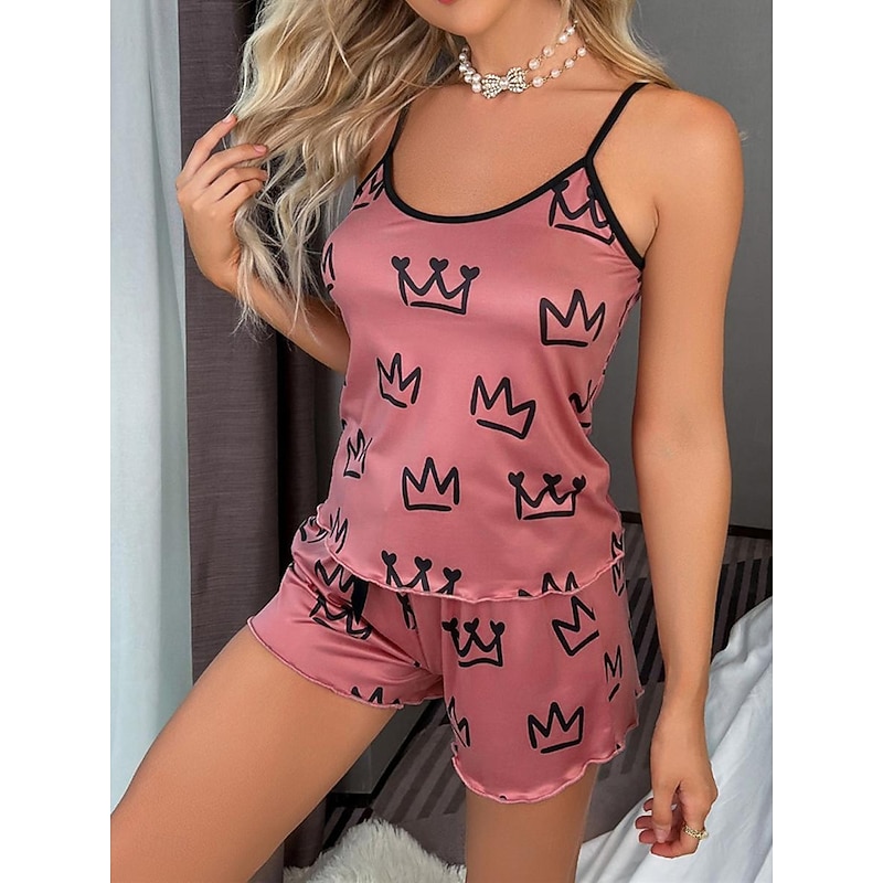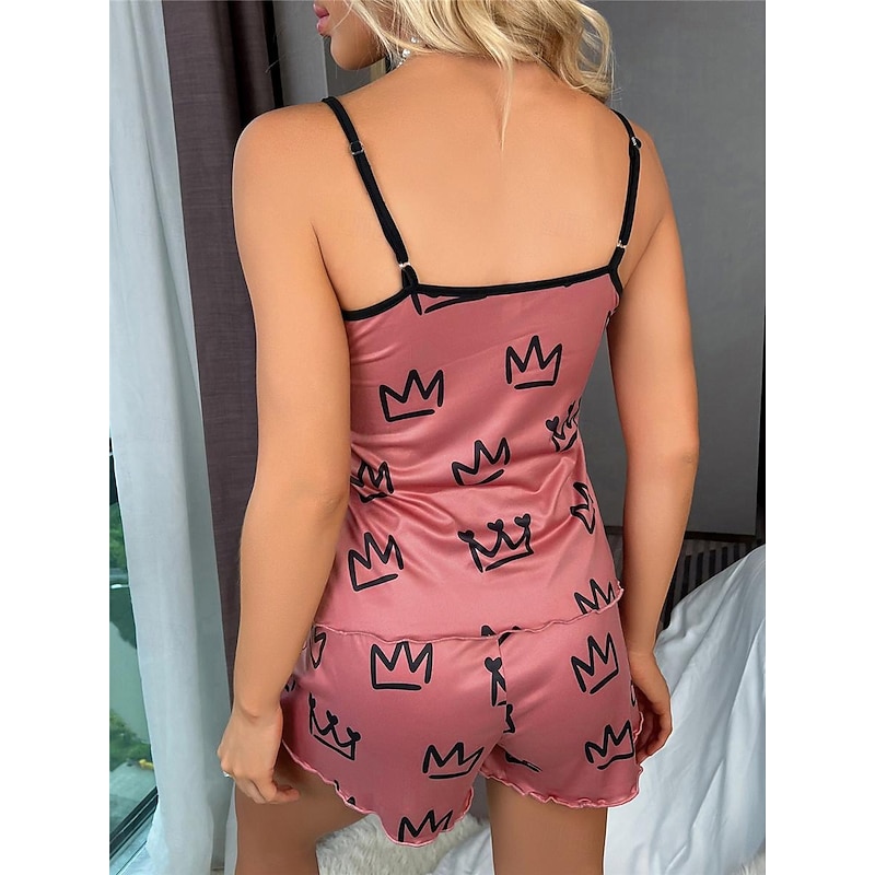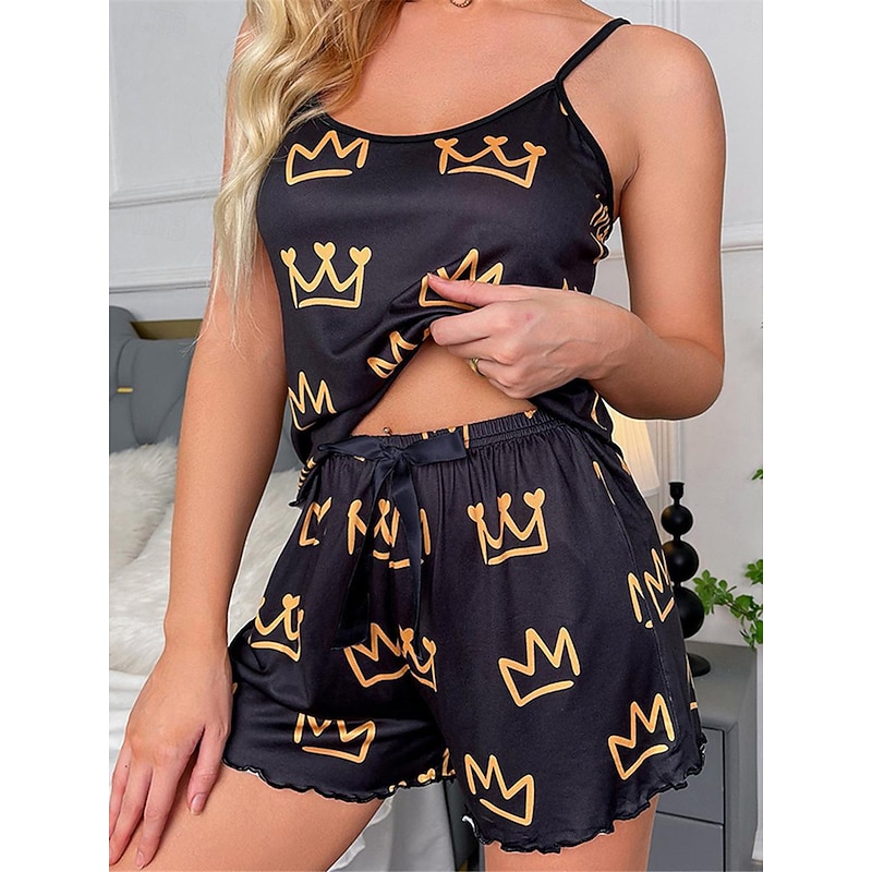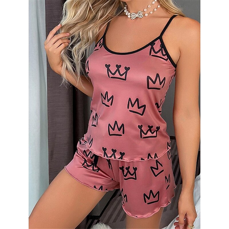 : This two-piece set features a relaxed, flattering fit with a sleeveless, strap top paired with shorts. The elastic waistband on the shorts ensures comfort and ease of wear throughout the night or day.