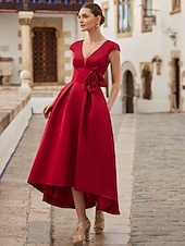 More information about A-Line Cocktail Dresses Beach Wedding Elegant Dress Formal Asymmetrical Short Sleeve V Neck Pocket Satin with Pocket Shouder Flower Dresses
