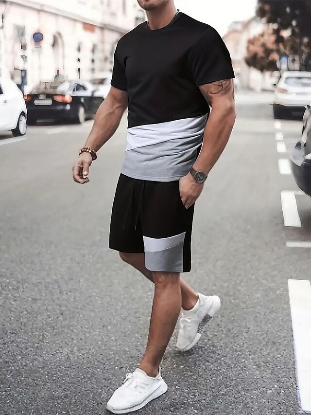 Men's T-shirt Suits Tee & Drawstring Waist Pants Short Sleeves Crew Neck Summer Gymnatics Casual Color Block Street Style Vacation Daily Wear Activewear Army Green Black Yellow Top Tee for Men 25