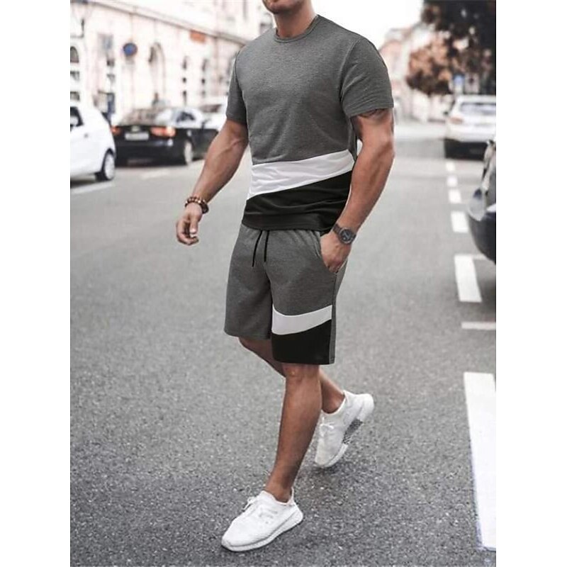 Men's T-shirt Suits Tee & Drawstring Waist Pants Short Sleeves Crew Neck Summer Gymnatics Casual Color Block Street Style Vacation Daily Wear Activewear Army Green Black Yellow Top Tee for Men 21