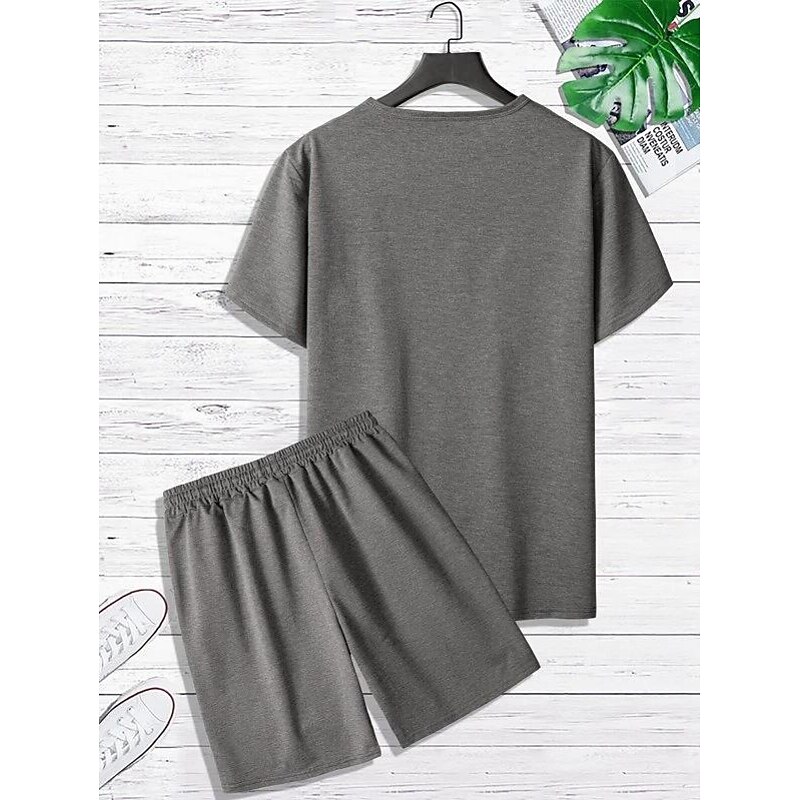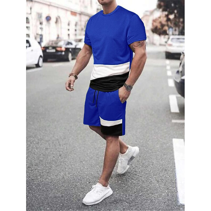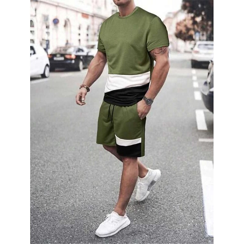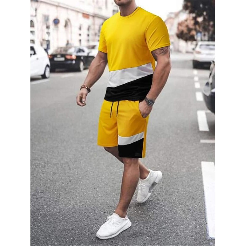 Men's T-shirt Suits Tee & Drawstring Waist Pants Short Sleeves Crew Neck Summer Gymnatics Casual Color Block Street Style Vacation Daily Wear Activewear Army Green Black Yellow Top Tee for Men 22