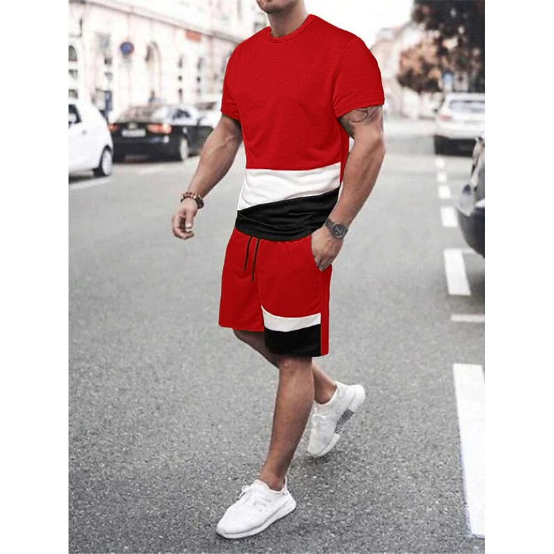 Men's T-shirt Suits Tee & Drawstring Waist Pants Short Sleeves Crew Neck Summer Gymnatics Casual Color Block Street Style Vacation Daily Wear Activewear Army Green Black Yellow Top Tee for Men 23