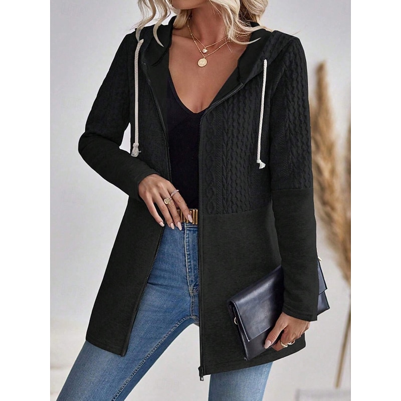 More information about Women's Winter Jacket Coat Textured Jackets Athleisure Holiday Daily Wear Fall Winter Regular Coat Regular Fit Stylish Casual Jacket Long Sleeve Solid Color Drawstring Full Zip Black Gray