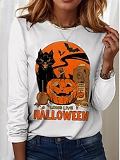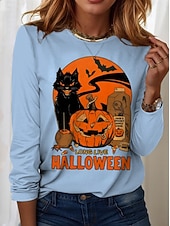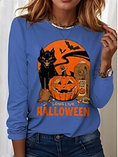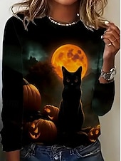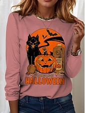More information about Halloween Women's T shirt Black Cat Graphic Cat Pumpkin Vintage Fashion Stylish Long Sleeve Crew Neck Round Neck Regular Tops Daily Weekend Print Black White Pink Blue Purple Spring Fall Winter