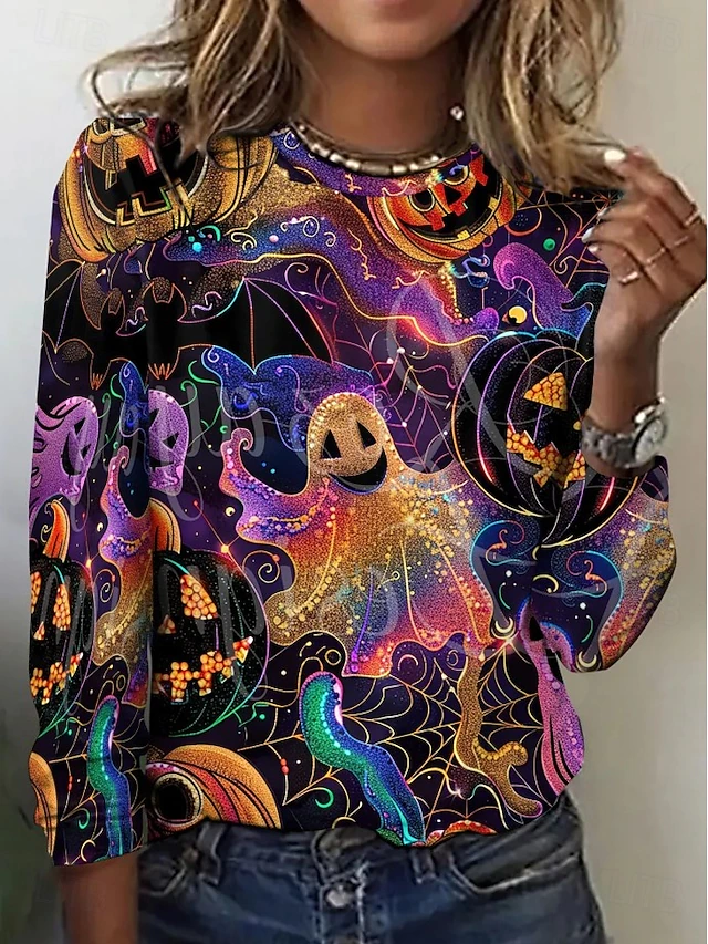 Halloween Women's T shirt Black Cat Graphic Cat Pumpkin Vintage Fashion Stylish Long Sleeve Crew Neck Round Neck Regular Tops Daily Weekend Print Black White Pink Blue Purple Spring Fall Winter 9