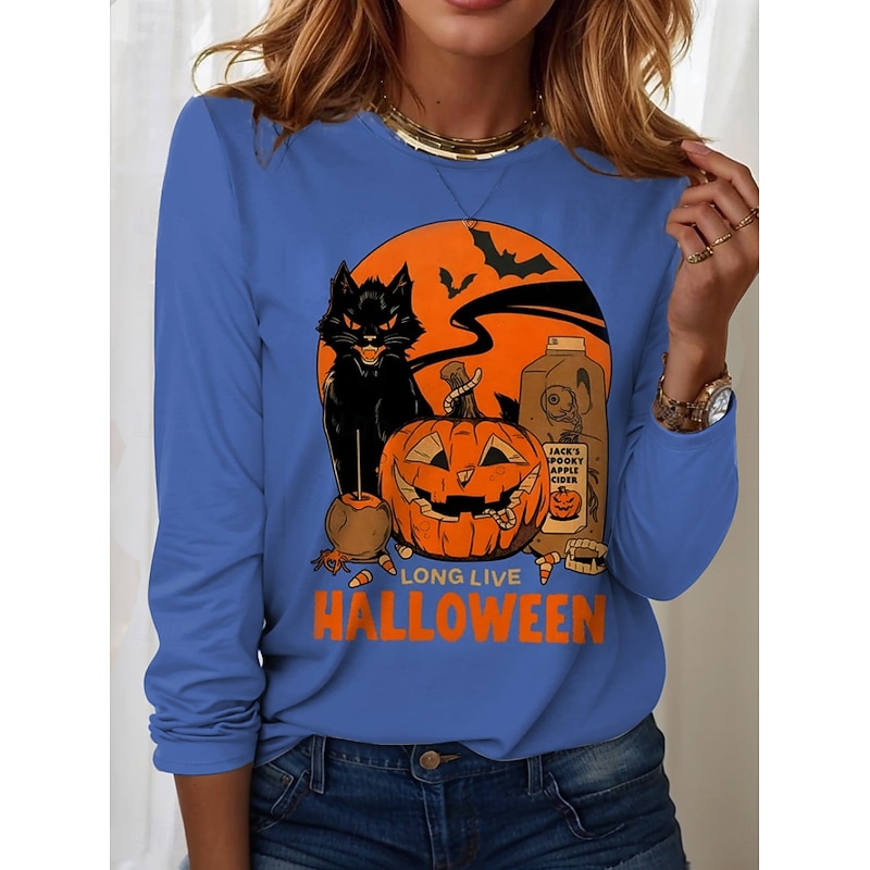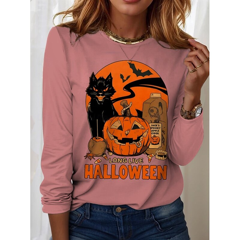 Halloween Women's T shirt Black Cat Graphic Cat Pumpkin Vintage Fashion Stylish Long Sleeve Crew Neck Round Neck Regular Tops Daily Weekend Print Black White Pink Blue Purple Spring Fall Winter 12