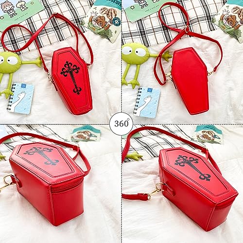 PORRASSO Gothic Crossbody Bag Women Shoulder Bag PU Messenger Bag Coffin Shape Handbags for Travel Halloween Daily Use Red 6