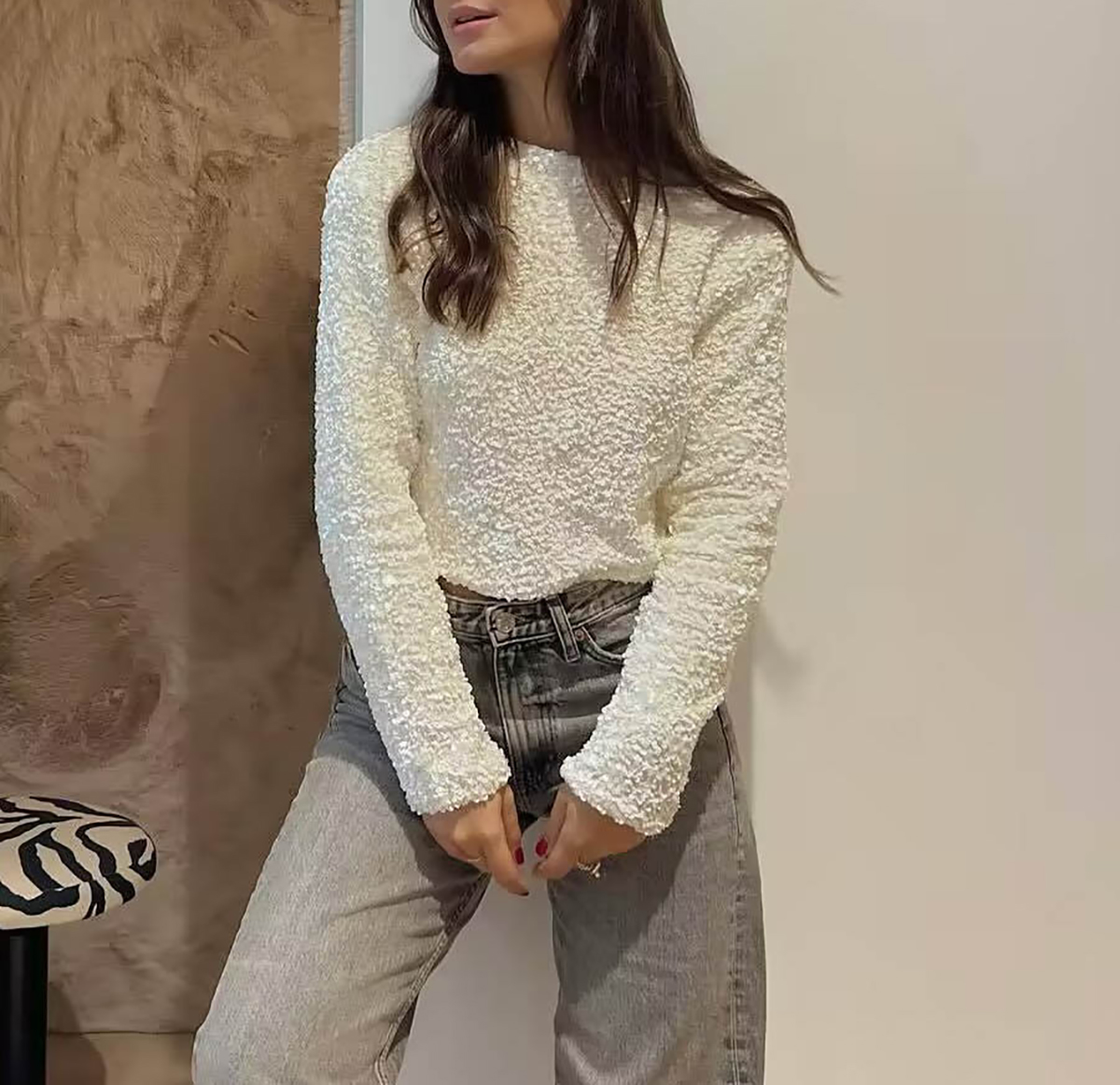 R.Vivimos Women's Long Sleeve Crop Tops Fall Winter Sequin Bow Tie Glitter Fashion Casual Tops Blouses 1