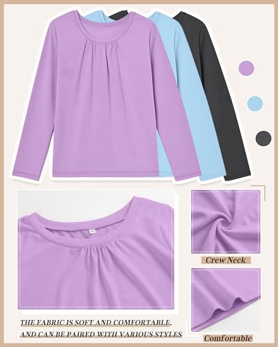 3 Pack Girls Long Sleeve Shirts Basic Casual Tops Loose Fit Kids Crewneck Solid Soft Layering Shirts 5