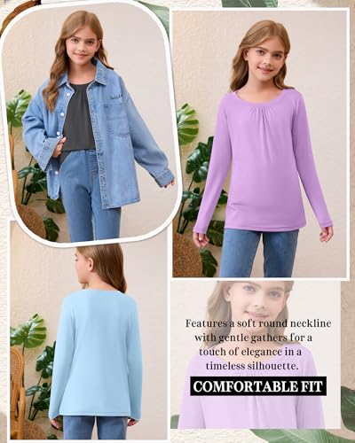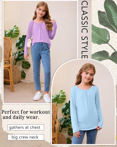 3 Pack Girls Long Sleeve Shirts Basic Casual Tops Loose Fit Kids Crewneck Solid Soft Layering Shirts 4