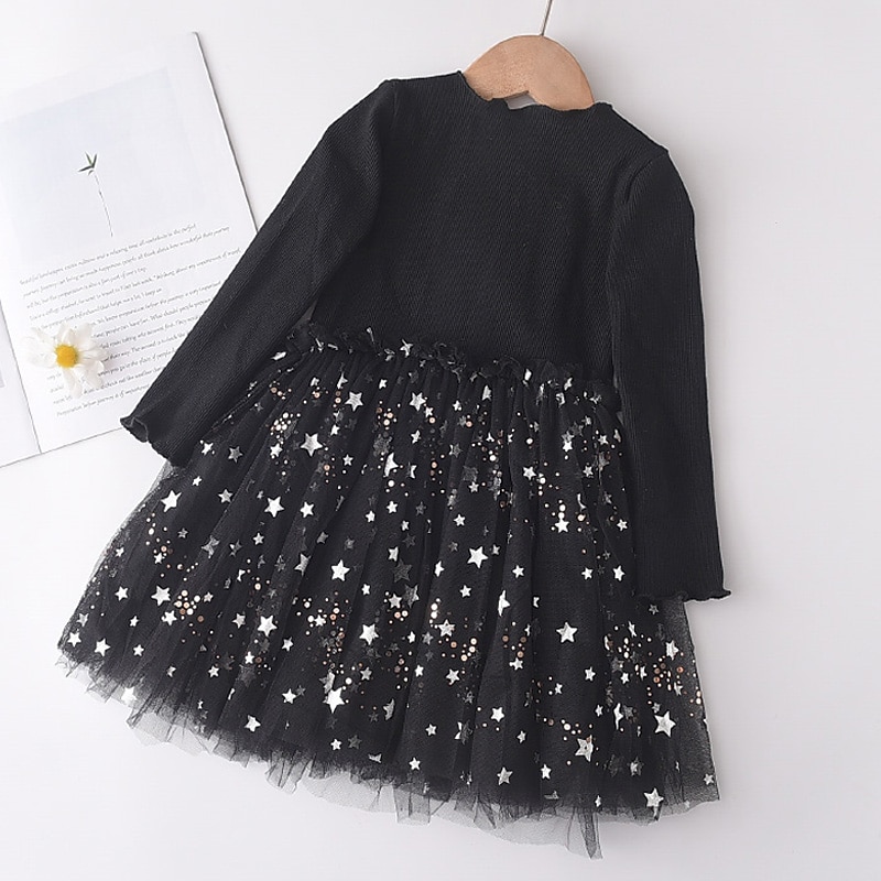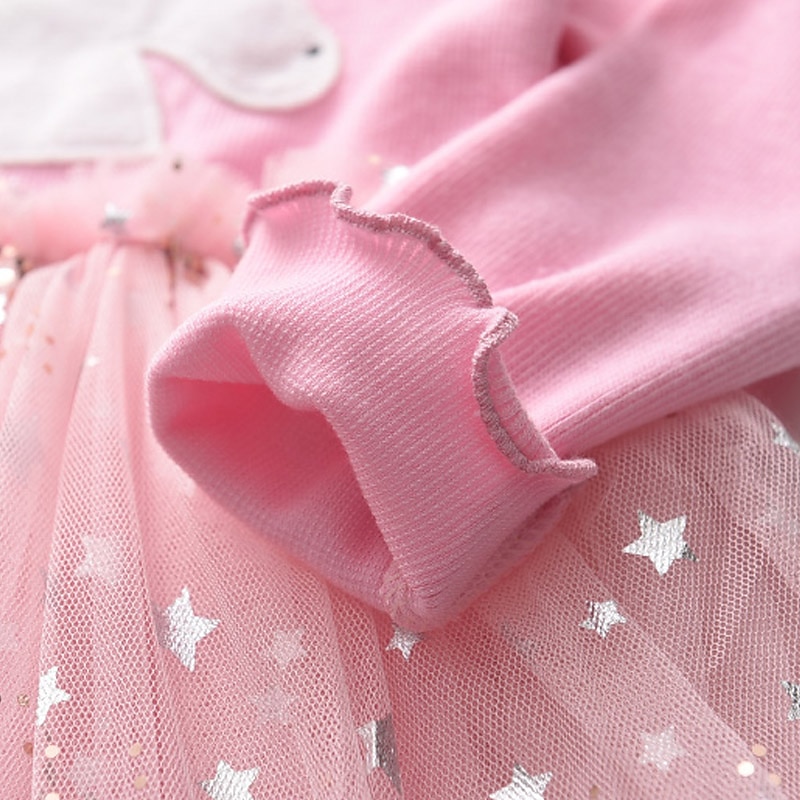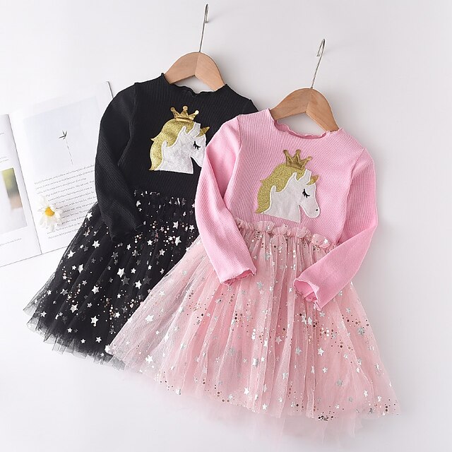 HOT ! Kids Girls' Dress Animal Cartoon Long Sleeve Sequins Patchwork Basic Cotton Knee-length Tulle Dress 2-8 Years Black Pink Purple