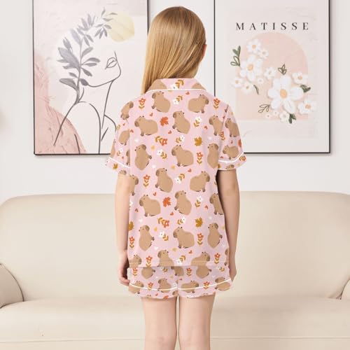 senya Cute Capybara Flower Leaves P Satin Summer Pajama Sets Silk Short Sleeve Button Down Sleepwear 1