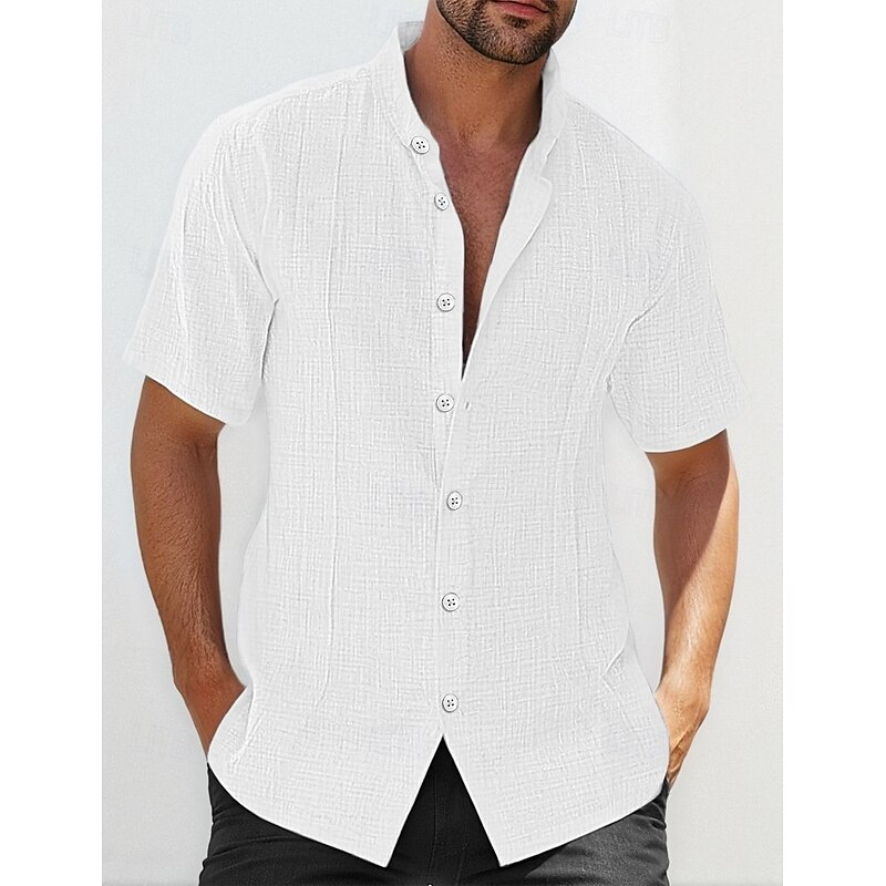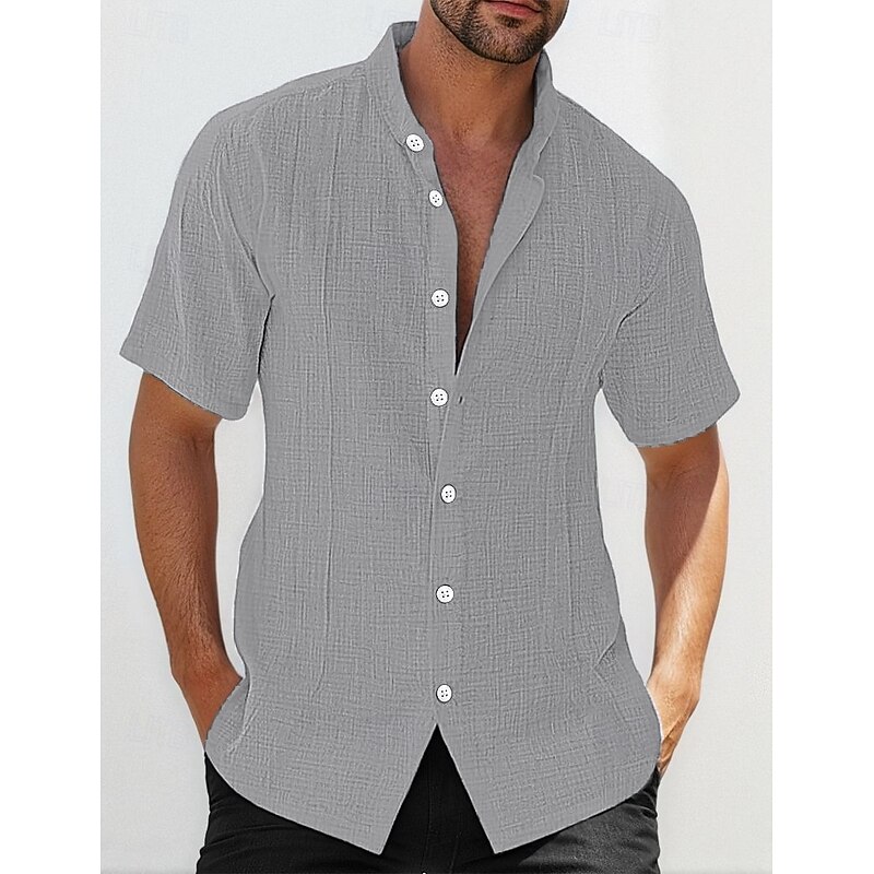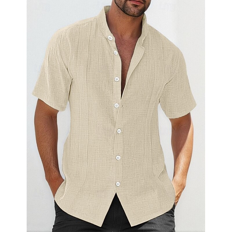 Highlights - Stay cool and stylish this summer with our cotton and linen blend Linen Shirt - Short sleeves for maximum comfort in the hot weather - Perfect for men for any occasion, whether it's going on vacation or daily wear - Features a stylish stand collar for a trendy look