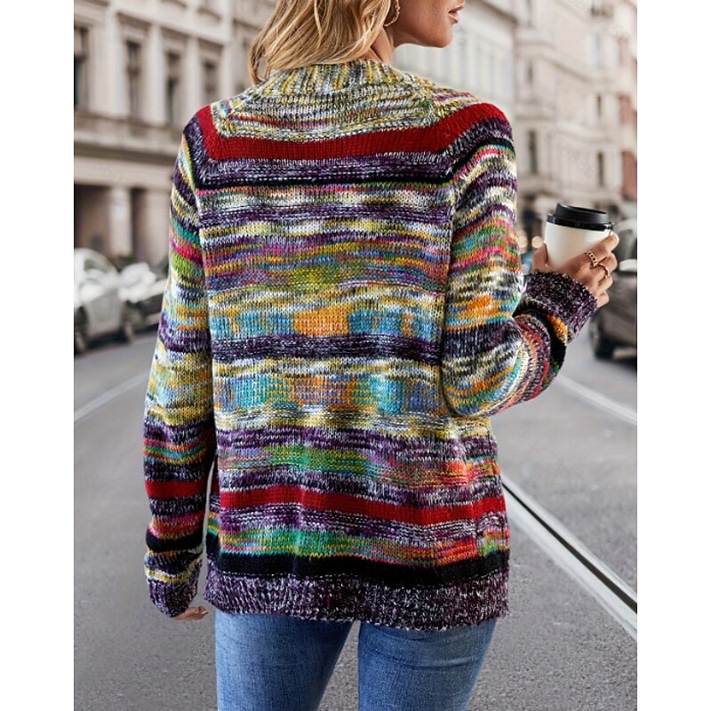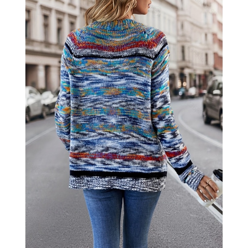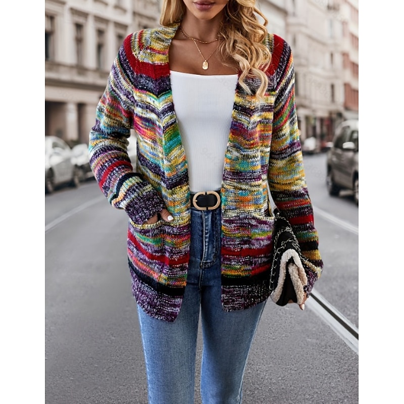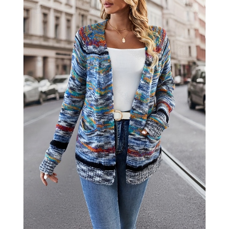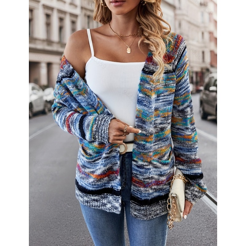 Highlights [Fabric] : Crafted from high-quality polyester, this cardigan features a ribbed knit that offers a soft and comfortable touch, making it perfect for fall and winter wear. The micro-elasticity ensures a flexible fit for added ease and comfort. [Fit Type] : This cardigan boasts a loose fit design, characterized by its long sleeves and regular top length, allowing for easy layering over casual outfits. The open-front style enhances its relaxed and cozy feel, making it a versatile addition to any wardrobe. [Design Highlights] : The vibrant striped pattern combines rich hues of blue, orange, and red, providing a lively touch to your look. It includes practical pockets, adding functionality to its stylish design. The ribbed knit style offers a subtle texture, while the open front neckline promotes easy wear. [Occasions] : Suitable for a variety of settings, this cardigan is an ideal choice for daily outings, weekend adventures, and outdoor activities in transitional seasons. Its vibrant colors and comfortable style make it a great option for casual gatherings or semi-casual events. [Size Range] : Available in sizes M, L, and XL, this cardigan offers a flexible fit, catering to a range of body types and ensuring that you can find the perfect size for your needs.