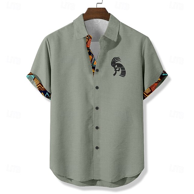 Men's Aztec Ethnic Kokopelli Shirt Summer Shirt Button Up Shirt Short Sleeve Vintage Retro Vacation Dailywear Beach Wear Summer Spring Turndown 3D Print Linen Like Shirt Blue Green Khaki 7