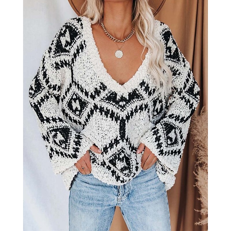 : The sweater features a classic crew neckline that complements its long sleeves, giving it a timeless appeal. The bold black and white geometric print adds a striking visual element, while the textured knit design elevates the overall aesthetic with an intricate pattern that catches the eye.
