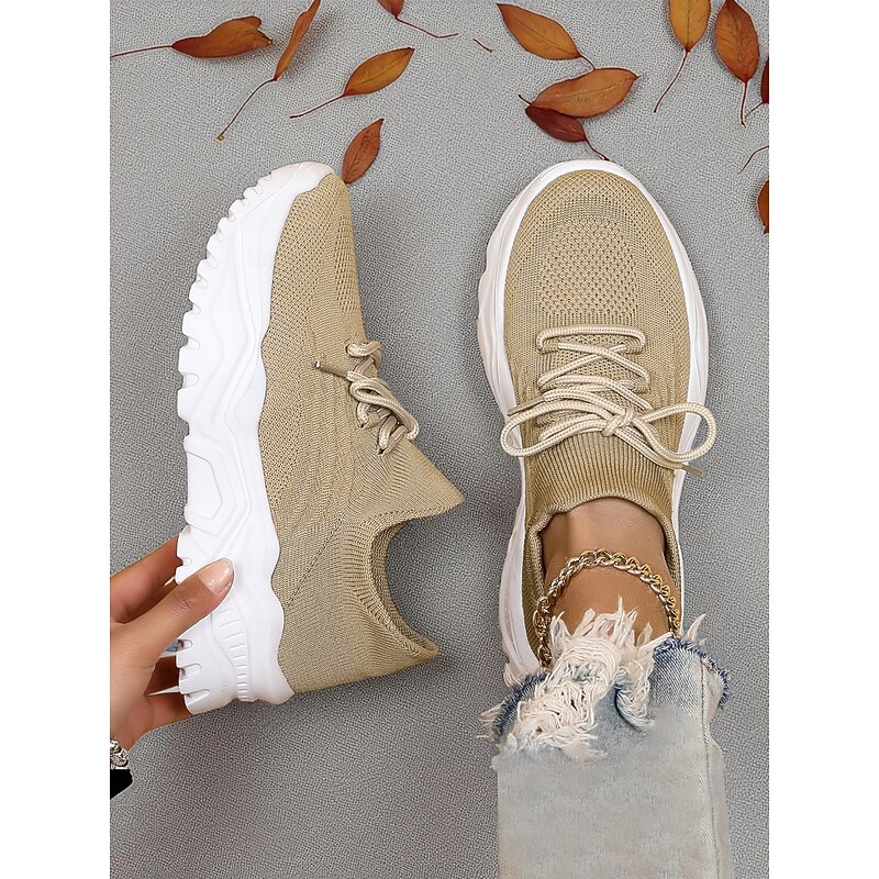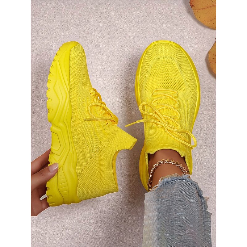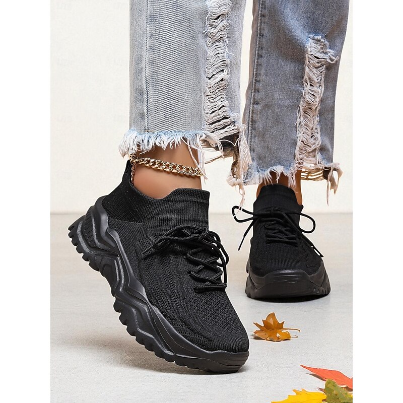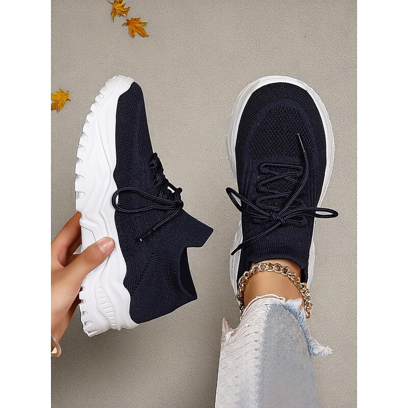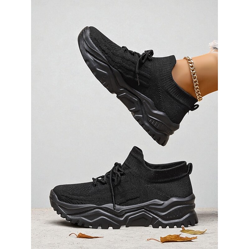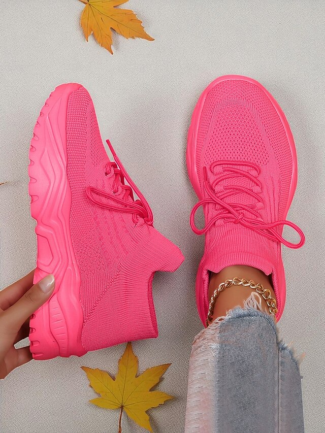 HOT ! Women's Red Flyknit Chunky Sole Sneakers – Breathable Lace-Up Sports Shoes for Casual Streetwear and Gym Training