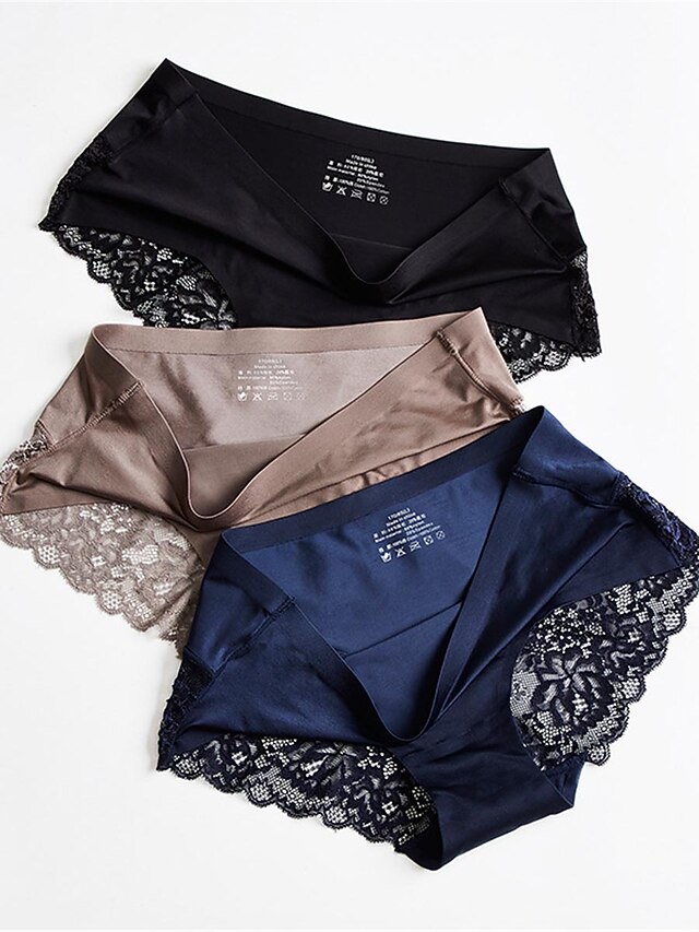 Highlights [Fabric] The Women's Sexy Lingerie Panties are made from a smooth, ice silk fabric that provides breathable comfort and a luxurious sensation against the skin. The fabric incorporates a blend that ensures both softness and micro-elasticity for a superior wearing experience. [Fit] These panties are designed with a seamless construction that ensures a sleek, comfortable fit with no visible lines. The low-rise cut offers a modern and flattering silhouette, making it ideal for everyday wear or special occasions. [Design Highlights] The sophisticated lace detailing at the waistband and leg openings adds elegance and femininity, while the unique hole pattern contributes a stylish twist. The bold solid colors, including black, taupe, and navy blue, provide a striking contrast to the intricate lace designs. [Occasions] Perfect for a variety of intimate settings, including Valentine's Day, a romantic night in, or simply as sexy nightwear at home. These panties ensure both style and comfort, whether you're spending a cozy night indoors or preparing for a special occasion. [Size Range] Available in a range of sizes including M, L, XL, 2XL, and 3XL, catering to diverse body types and ensuring a great fit for a broad audience.