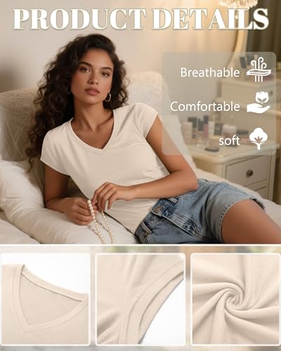 • Trendy Design: the women's tops design with v neck, it's a nice way to show off the line of the neck and look slender; The cap sleeve use minimalist design combines functionality and beauty, and can modify the shoulder line