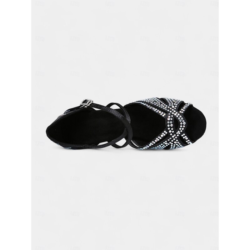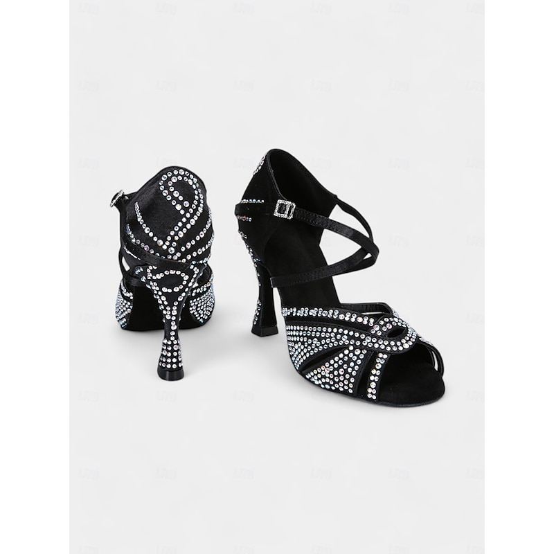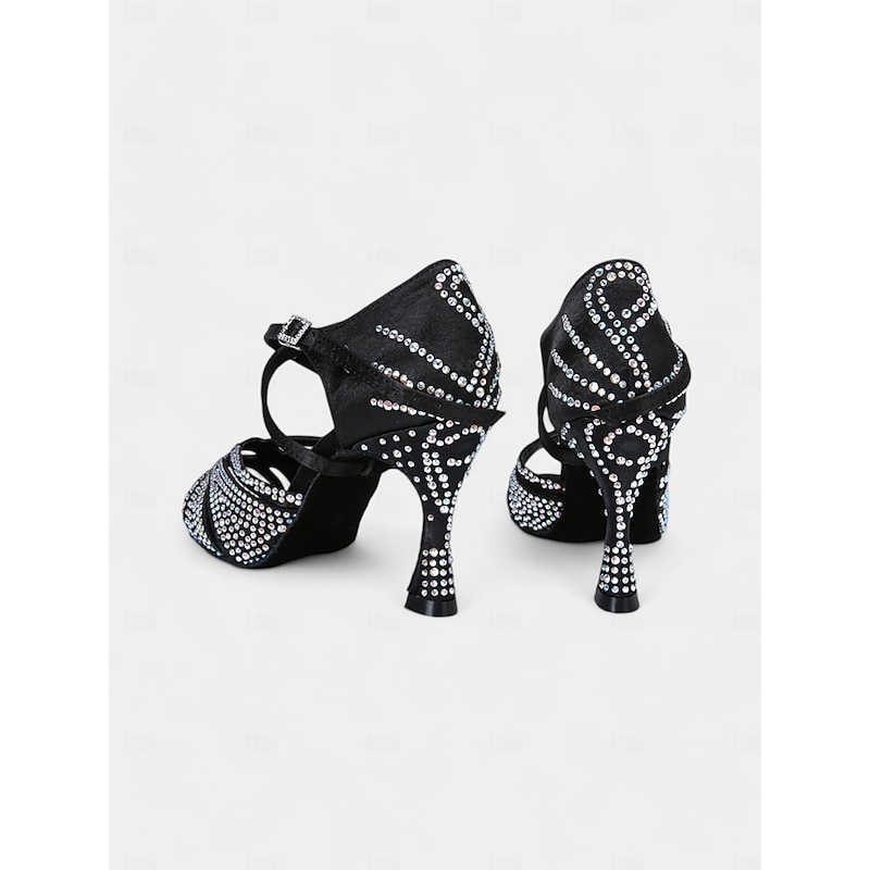 Highlights [Fabric] : Crafted from high-quality satin with a durable suede sole, these dance heels provide a luxurious feel and excellent flexibility, designed to keep your feet comfortable throughout your dance performances. The rhinestone embellishments add a captivating sparkle that stands out on the dance floor. [Fit] : Featuring a classic strappy design with a round open-toe style, these shoes offer a breathable fit that allows for ease of movement. The secure lace-up closure and supportive ankle strap ensure an adjustable and snug fit, providing stability during intricate dance steps. [Design Highlights] : These dance heels sport a sophisticated crisscross strap pattern adorned with sparkling rhinestones, perfect for catching the light with every move. The 3 1/4-inch flare low heel not only enhances your height but also ensures balance and elegance, complementing every twirl and turn on the floor. [Occasions] : Ideal for ballroom and Latin dance performances, such as Samba, ChaCha, and Rumba, the shoes are also suitable for parties and evening events. Their stylish and supportive design makes them a perfect choice for both professional dancers and those looking to make an impression on the dance floor. [Size Notice] : Available in a range of sizes from US5.5 to US10.5, these shoes are designed for women's sizing. We recommend selecting your usual size for the best fit, ensuring comfort and ease during your performances.