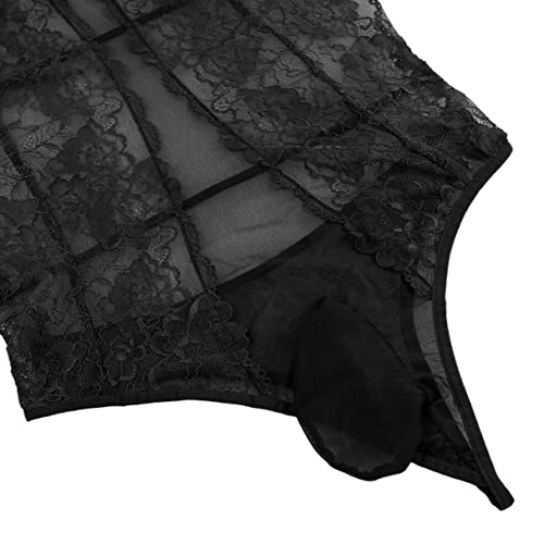 iiniim Men's One-Piece Sheer Floral Lace Bodysuit Sissy Pouch Thong Leotard Crossdress Lingerie Nightwear 7