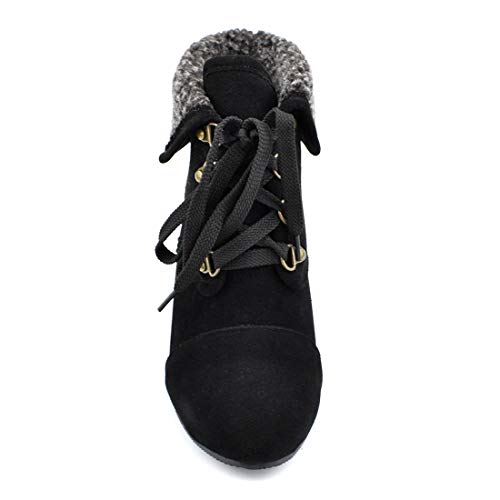 VOKLIN Women's Winter Fur Cuff Wedge Ankle Boots Suede Lace Up Round Toe Chunky High Heel Dress Short Booties 7