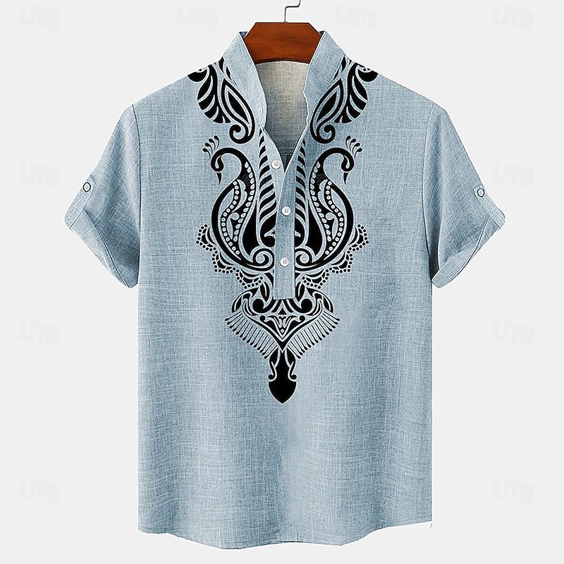 Highlights [Fabric] : Crafted from a blend of 20% linen, 20% cellulose, and 60% polyester, this men's shirt is lightweight and breathable, making it perfect for spring and summer weather. [Fit] : The shirt features a regular fit with short sleeves, ensuring comfort and ease of movement throughout the day. [Design Highlights] : The shirt showcases an intricate ethnic print across the chest, set against a light gray background for a striking visual effect. The mandarin collar adds a touch of sophistication, while the button placket and optional roll-up sleeves with button tabs enhance its versatile, casual style. [Occasions] : Ideal for a range of occasions, from daily wear to holiday outings. Whether you're dressing for a casual day out or looking for something stylish for a relaxed gathering, this shirt is a suitable choice. [Size Range] : Available in sizes S, M, L, XL, 2XL, and 3XL, catering to a variety of body types.