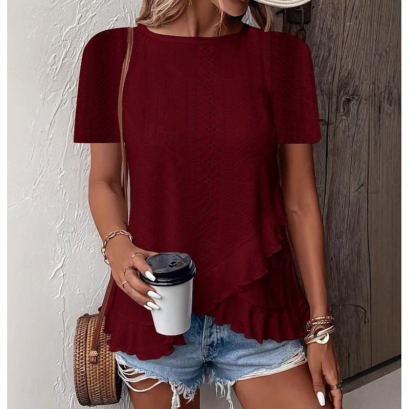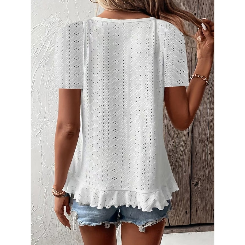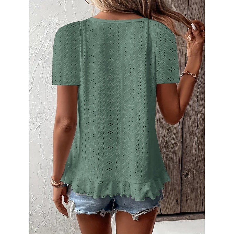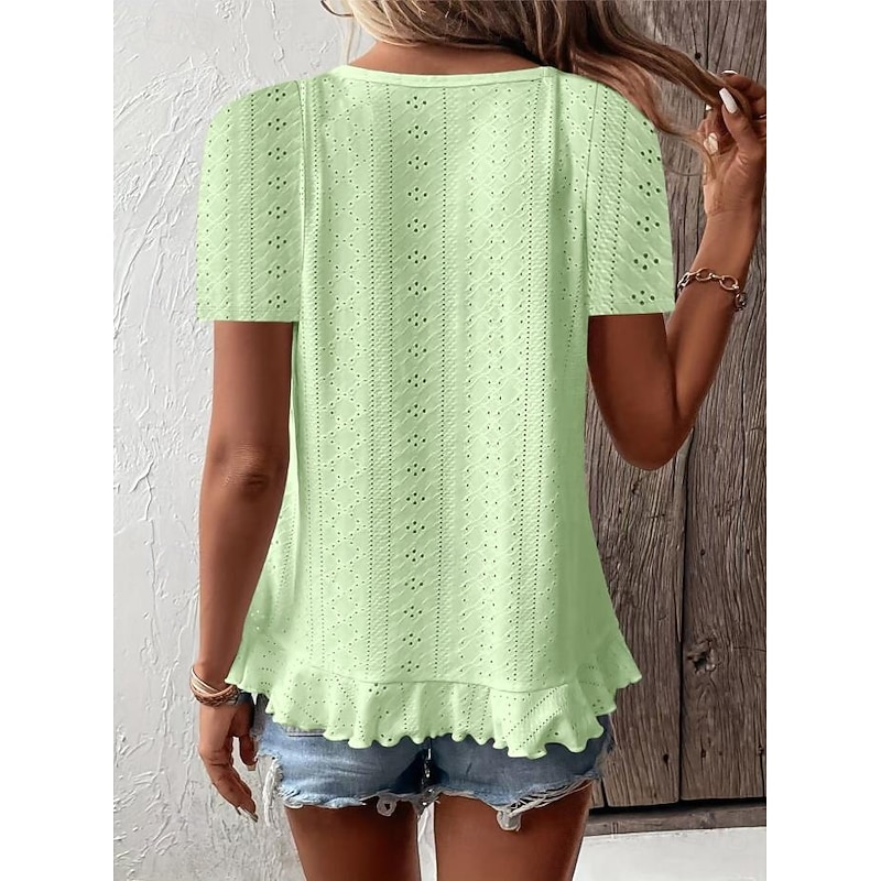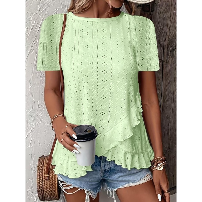 HOT ! Women's T Shirt Solid Color Plain Basic Casual Short Sleeve Crew Neck Regular Tops Daily Weekend Ruffle Eyelet White Yellow Pink Green Summer