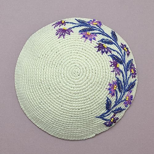 Cream & Lavender Purple Flowers Crochet & Embroidered Womans Kippah - Ladies Yarmulke 1
