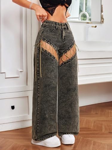jeans for women trendy Hollow Out Solid Color Wide Leg Jeans With Pockets, Casual 6