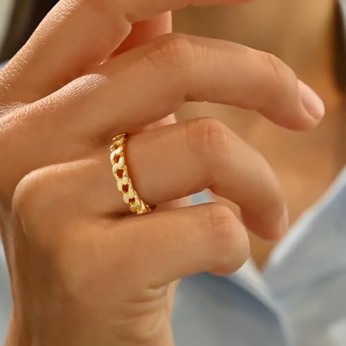 • Cuban Link Chain Ring: This bold yet minimalist 18K gold plated ring features an authentic Cuban chain link design that wraps elegantly around your finger. The high-polish finish catches light beautifully, creating a luxe look perfect for fashion-forward women who love making subtle statements.