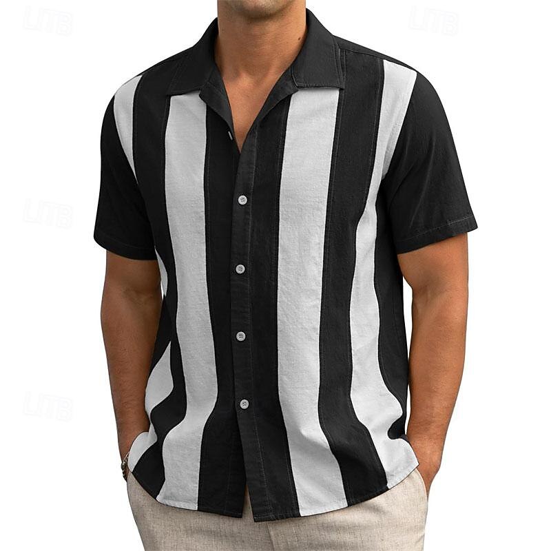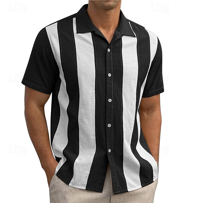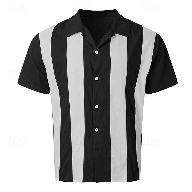 : This shirt boasts a bold vertical stripe pattern in black and white, creating a striking and modern look. The camp collar adds a touch of retro style, while the button-down front brings in an element of sophistication. Available in versatile colors like green, black, and khaki, it complements different fashion preferences.