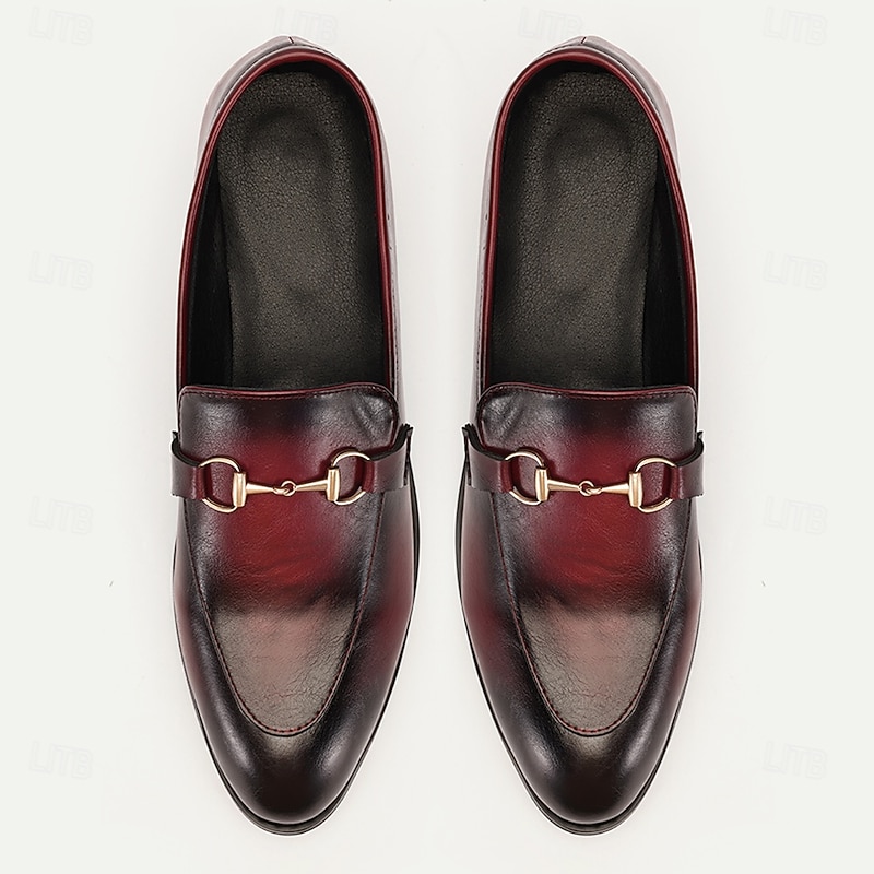 Highlights [Men's Burgundy Gradient Leather Loafers with Metal Bit Detail] [Fabric] : Crafted from high-quality PU leather, these men's loafers exude sophistication. The PU upper and lining offer a luxurious feel combined with durability for long-term wear. The deep burgundy to black gradient adds a touch of elegance, making these loafers a versatile addition to your wardrobe. [Fit] : Designed with a sleek silhouette, these loafers feature a comfortable slip-on style that is both stylish and convenient. The round toe shape ensures a classic look, while providing ample space for comfort. [Design Highlights] : These loafers are adorned with a stylish metal horsebit detail on the upper, adding a modern twist to a timeless design. The polished finish enhances the overall luxurious appeal, suitable for any formal setting. [Occasions] : Perfect for both formal and semi-formal events, these loafers are ideal for business meetings, parties, and evening gatherings such as Christmas or other festive occasions. They seamlessly blend style with practicality, making them suitable for a range of special events. [Size Notice] : Available in a range of sizes to fit various needs, these loafers are offered in US sizes 6 to 12. Choose the size that best suits your foot for a comfortable and elegant fit.