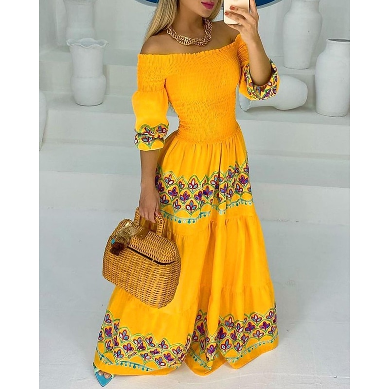 More information about Women's Casual Dress Long Dress Maxi Dress Yellow Half Sleeve Floral Patchwork Fall Spring Autumn Off Shoulder Modern Weekend Slim 2023 S M L XL XXL